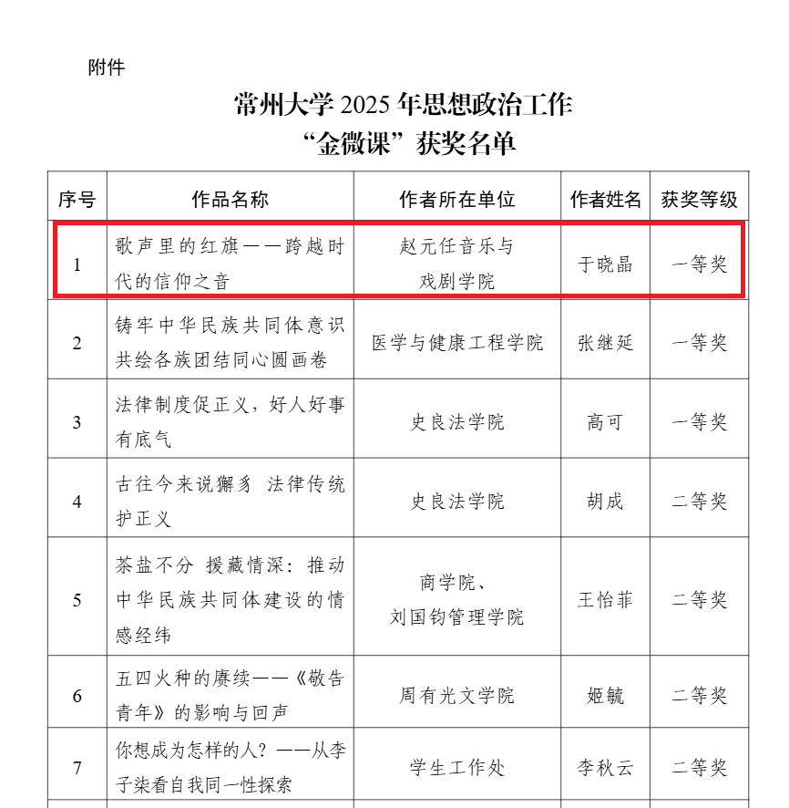 近日,黑料网 党委宣传部公布了2025年思想政治工作“金微课”征集评选结果。经专家评审,黑料网于晓晶老师主讲的微课作品《歌声里的红旗——跨越时代的信仰之音》荣获一等奖,展现了黑料网 在思想政治教育和艺术融合育人方面的积极探索与优异成果。
