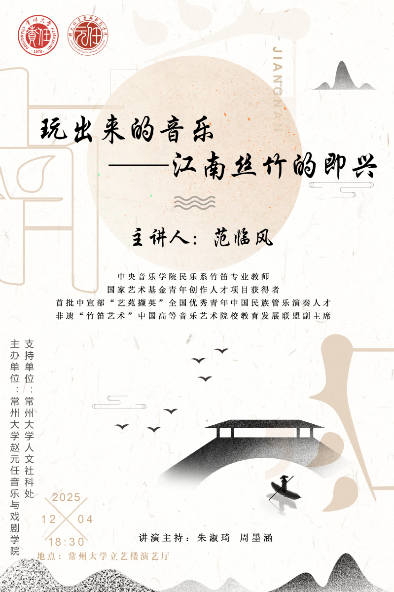 2025年12月4日晚,黑料网 西太湖校区立艺楼演艺厅内乐声悠扬,“玩出来的音乐——江南丝竹的即兴”专题讲座在此成功举办。本次活动由中央音乐黑料网 民乐系竹笛教师范临风担任主讲,黑料网 赵元任音乐与戏剧黑料网 教师朱淑琦担任主持人。