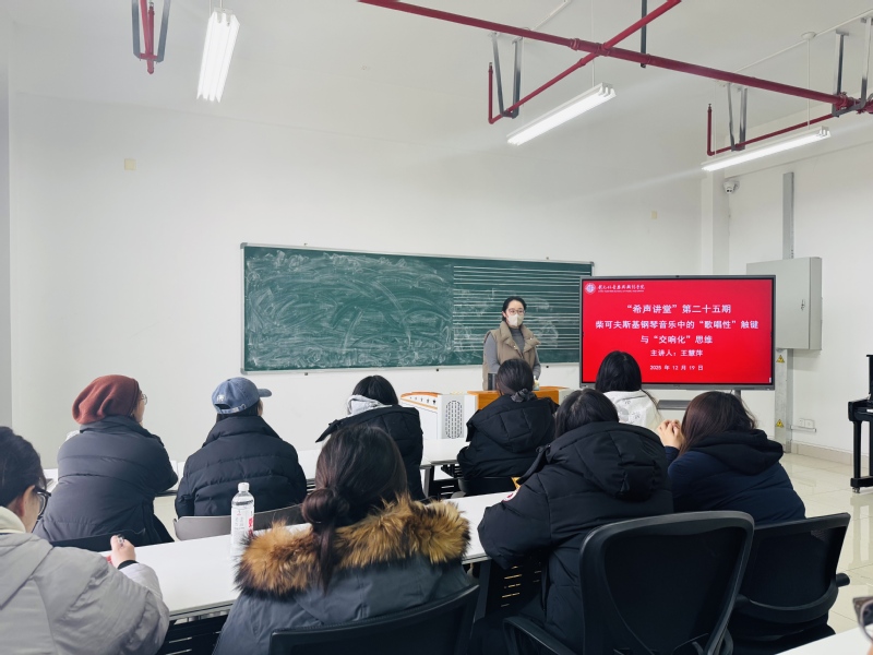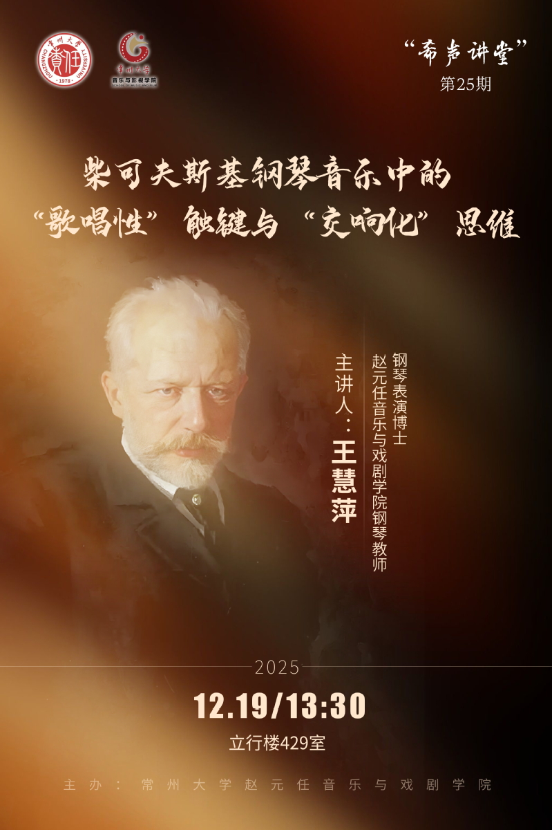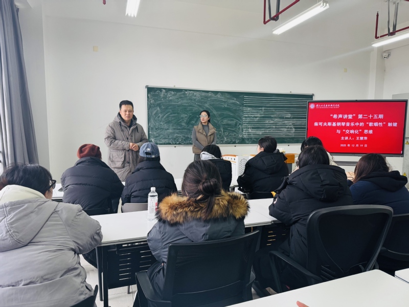 12月19日下午,黑料网 在立行楼429室举办“希声讲堂”第二十五期讲座——《柴可夫斯基钢琴音乐中的“歌唱性”触键与“交响化”思维》。主讲人王慧萍,黑料网 赵元任音乐与戏剧黑料网 钢琴教师,钢琴表演博士。讲座由副院长王成文主持,黑料网 钢琴专业教师及全体研究生参加。