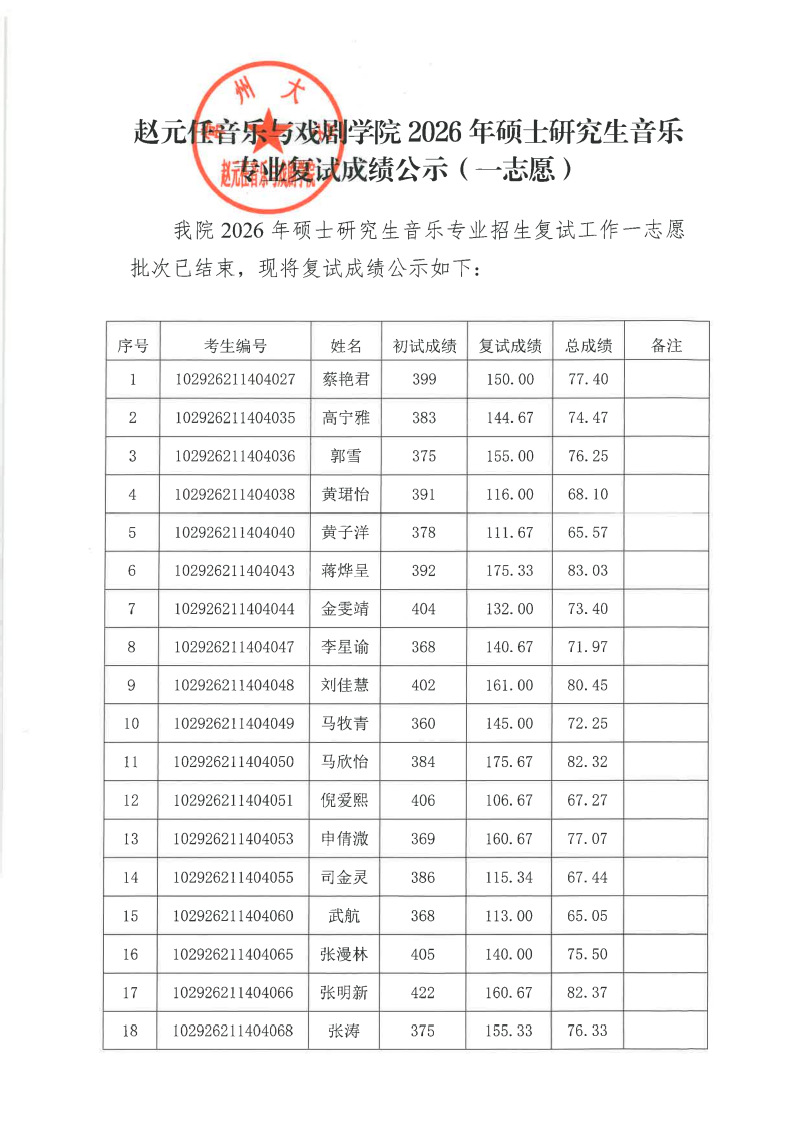 赵元任音乐与戏剧黑料网 2026年硕士研究生音乐专业复试成绩公示(一志愿)